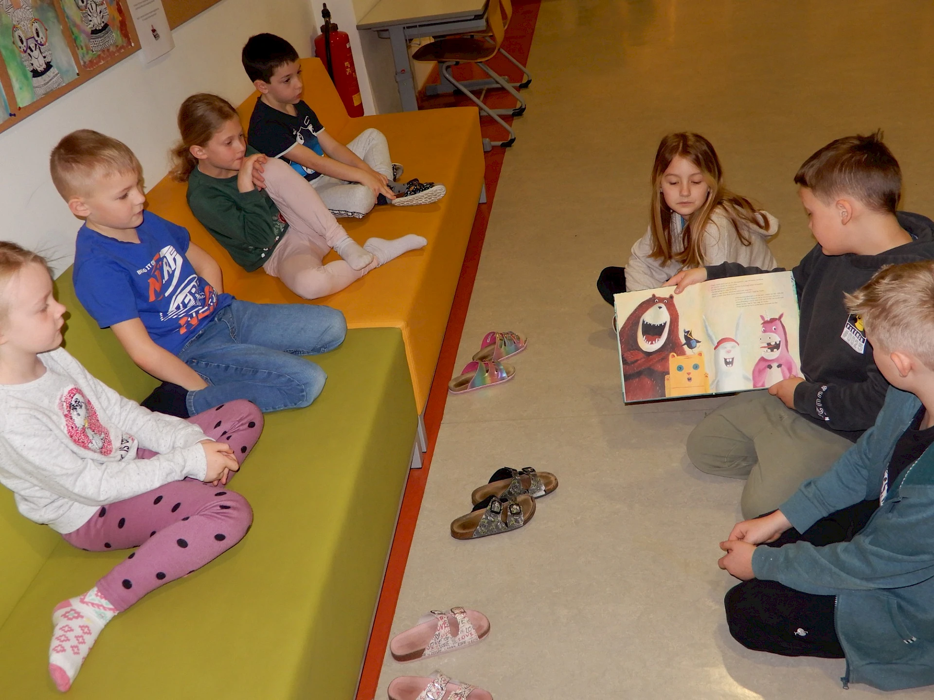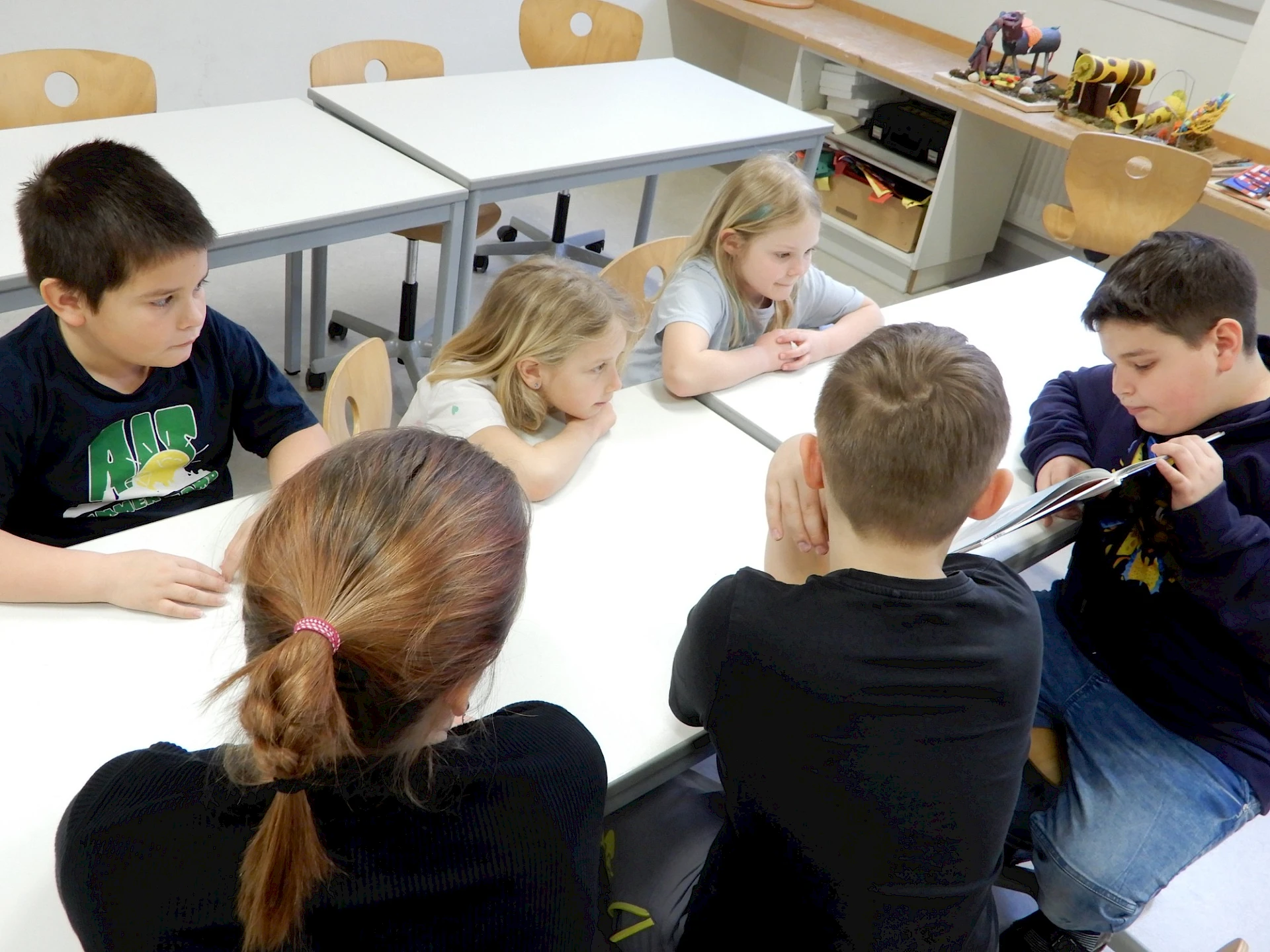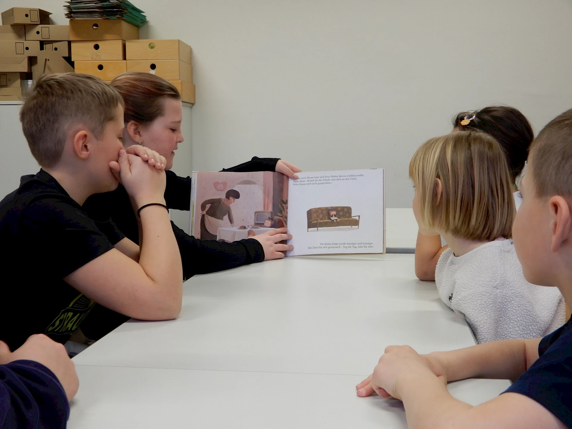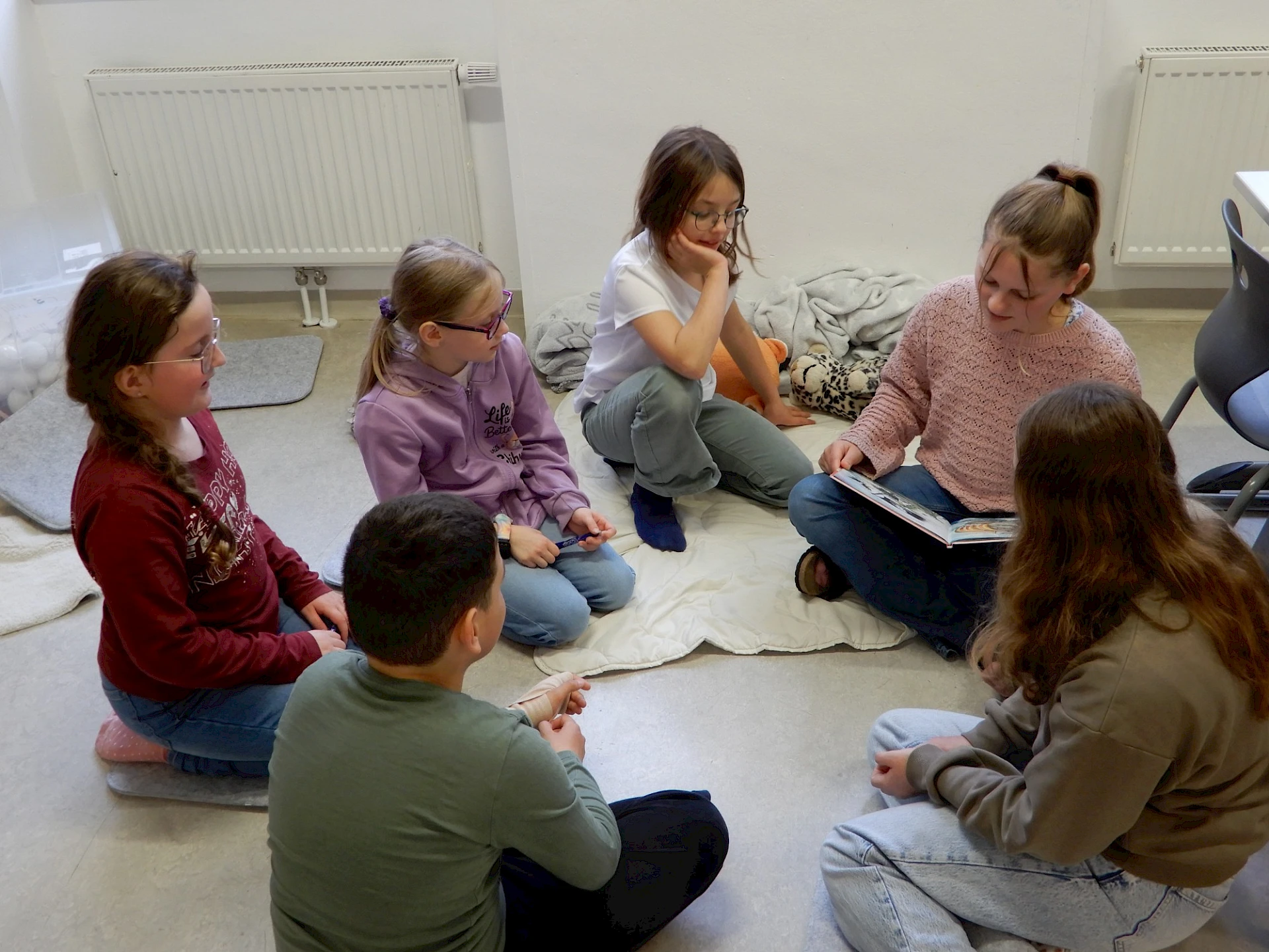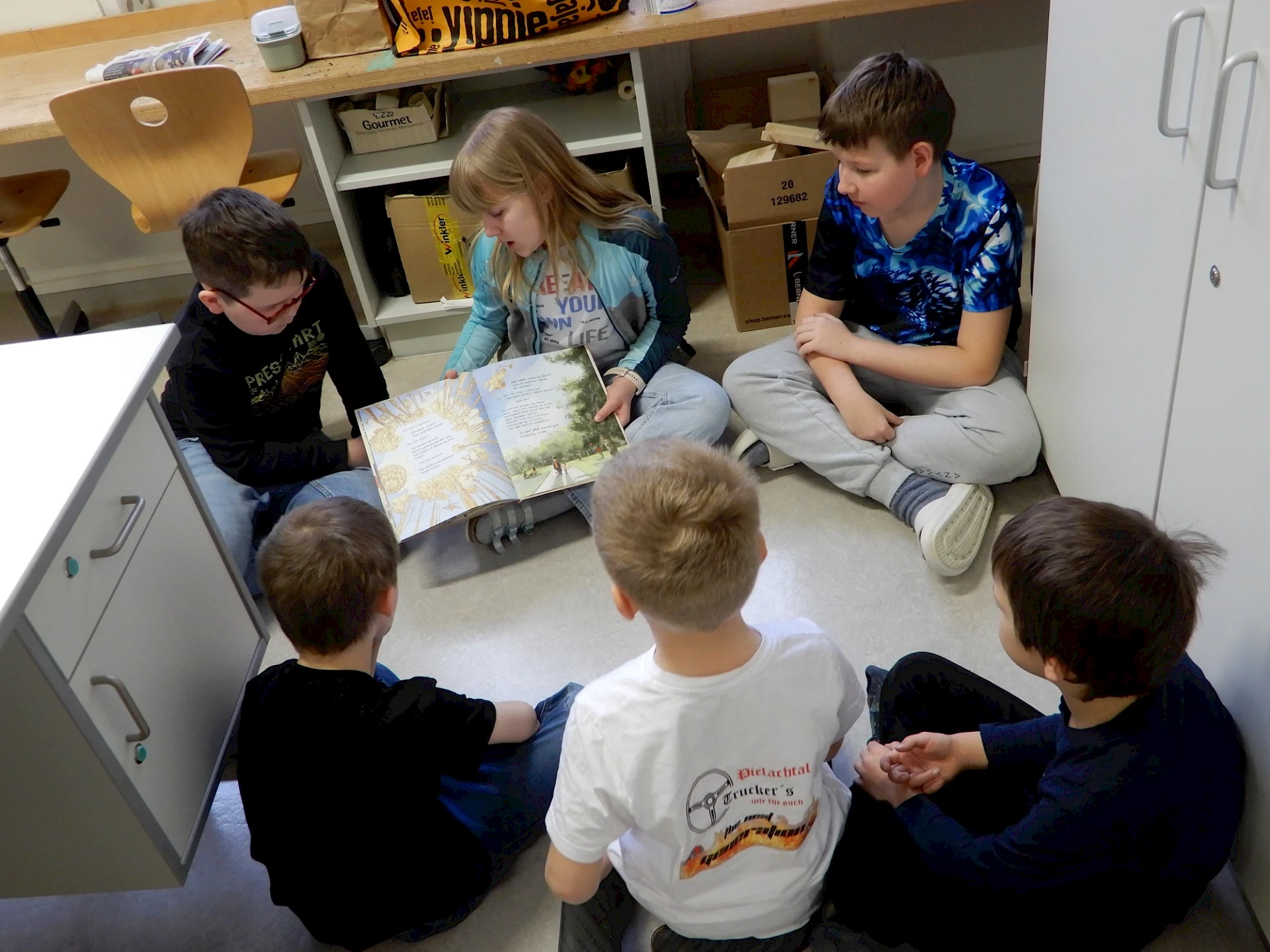 26.03.2026Im Rahmen des österreichischen Vorlesetages haben am 26. März die Kinder der 1. Klasse der Mittelschule den VolksschülerInnen aus der 1. Klasse aus ausgewählten Bilderbüchern vorgelesen. Die SchülerInnen der 3. Klasse - Deutsch AHS nahmen sich an diesem Vormittag Zeit für die Kinder der 2. Volksschulklasse. Auch ihnen wurde gruppenweise aus netten Bilderbüchern aus der Bibliothek vorgelesen. Es war sehr nett zuzuschauen und zu erkennen, wie wertschätzend alle miteinander umgegangen sind. Allen Beteiligten - den Größeren, wie auch den Kleineren - haben diese besonderen Deutsch-Stunden gut gefallen.